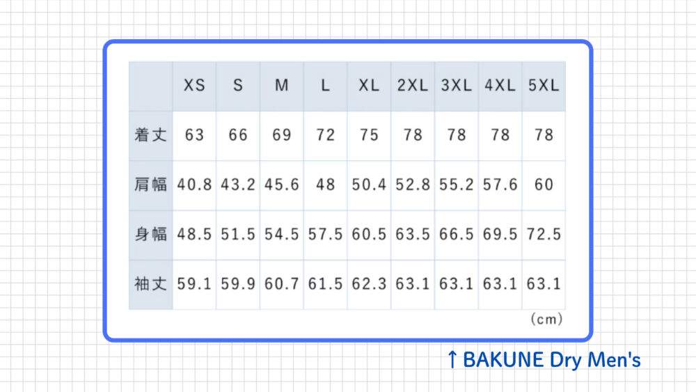 BAKUNEはXSから5XLという驚異的なサイズ展開を誇り、さらに上下別々のサイズで購入可能です。「肩幅が広いから上はL、下はM」といった買い方ができるため、どんな体型の方でもジャストフィットします。