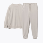 表面はシアバター加工によって、軽くしなやかな肌触りを実現。従来のスウェット素材特有の硬さを抑えつつ、ストレッチ性を備えることで動きやすさを確保しています。生地は綿67%・ポリエステル30%・ポリウレタン3%という構成で、伸縮性や快適性を両立。日常使いにも適した耐久性が意識されており、洗濯による機能劣化を抑える設計です。