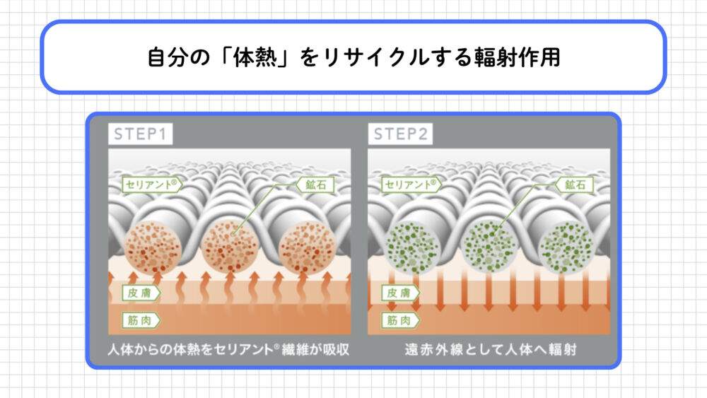 私たちの体から放出される熱エネルギーを繊維内の鉱石が吸収し、それを「遠赤外線」として再び体へ跳ね返します。