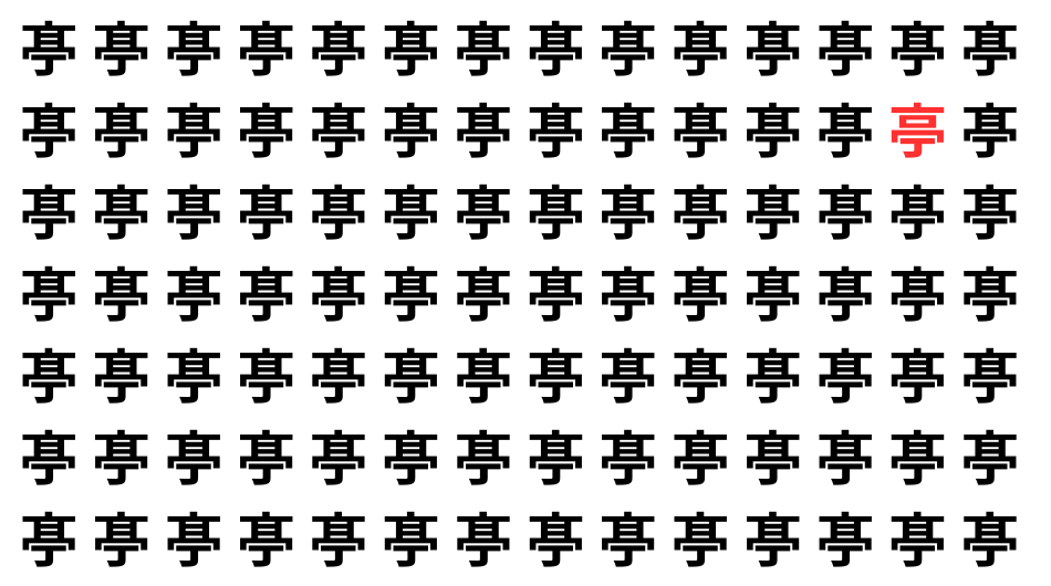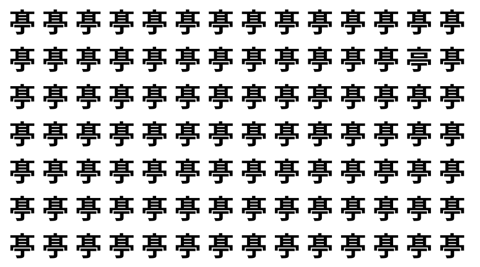 たくさんの漢字の中に、よく似た別の漢字「亭」が1文字だけ隠れています。