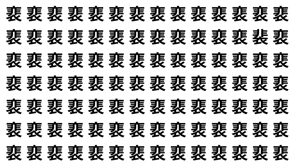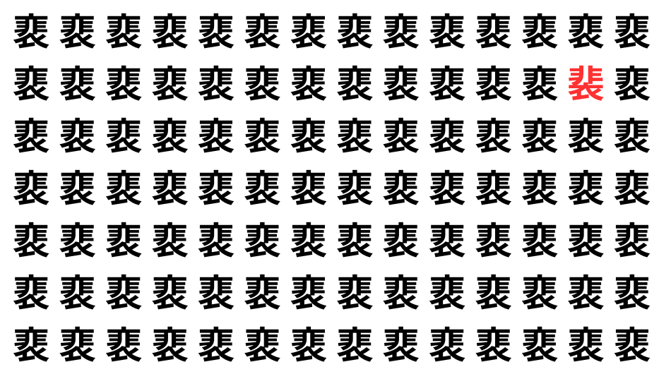 たくさんの「裵」の中に、よく似た別の漢字が1文字だけ隠れています。