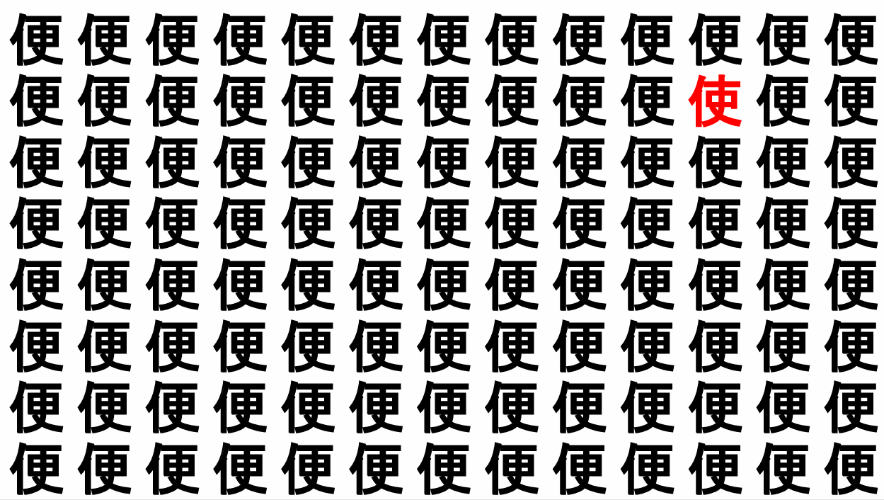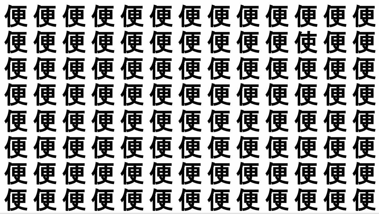 たくさんの「便」の中に、よく似た別の漢字が1文字だけ隠れています。