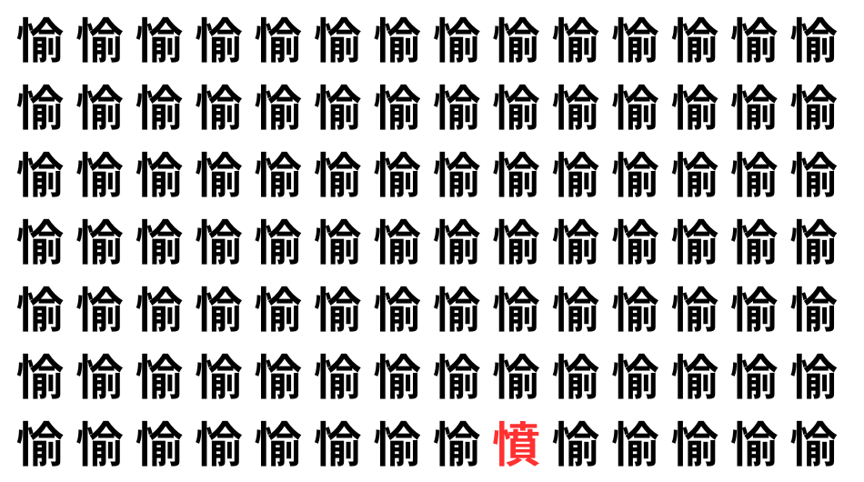 並んだ漢字の中に、ひとつだけ異なる文字が紛れています。集中して探し出し、気分をリフレッシュしましょう!