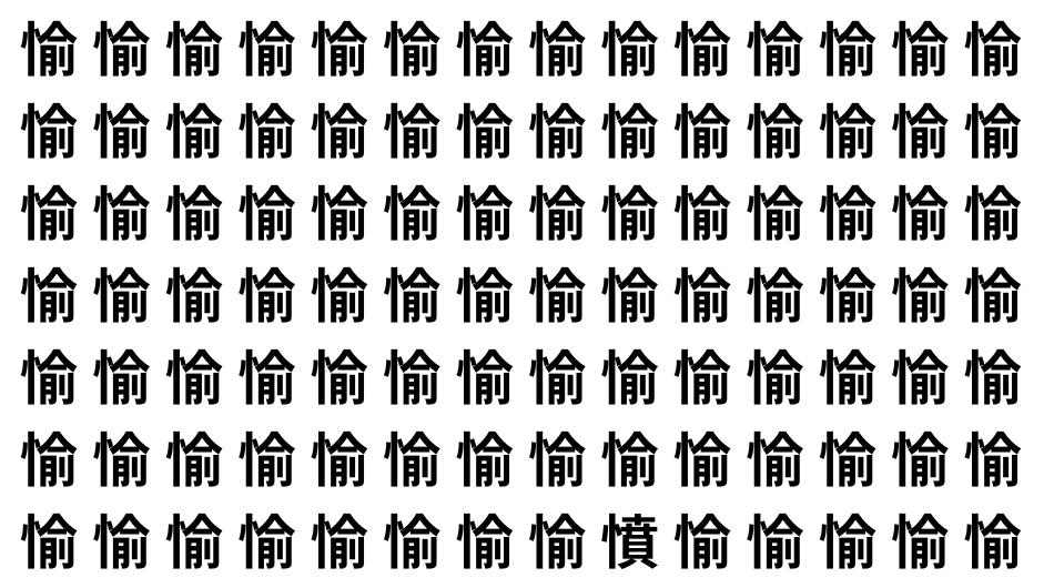 たくさんの「愉」の中に、よく似た別の漢字が1文字だけ隠れています。