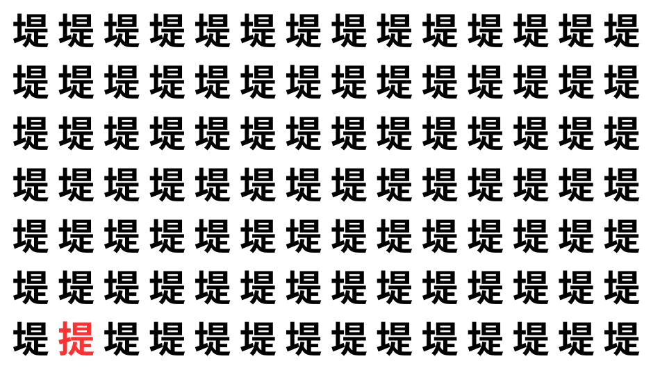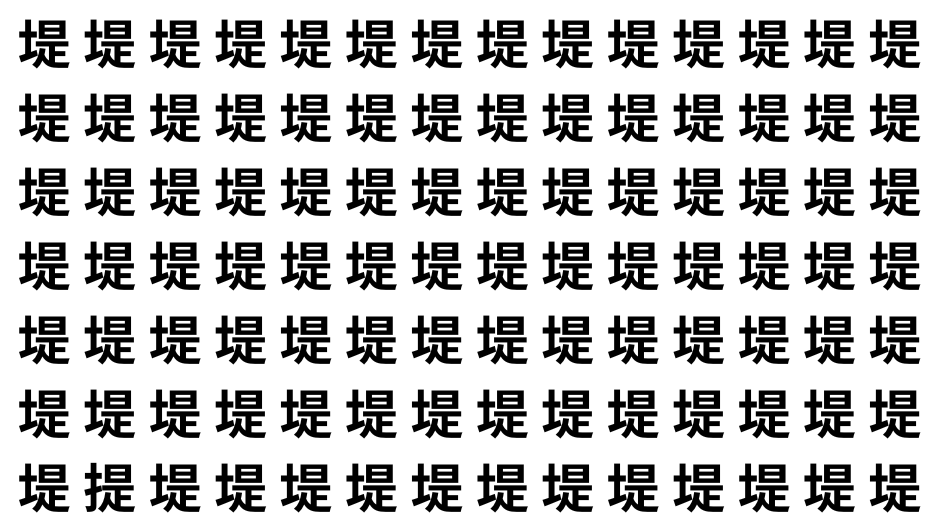 たくさんの「堤」の中に、よく似た別の漢字が1文字だけ隠れています。