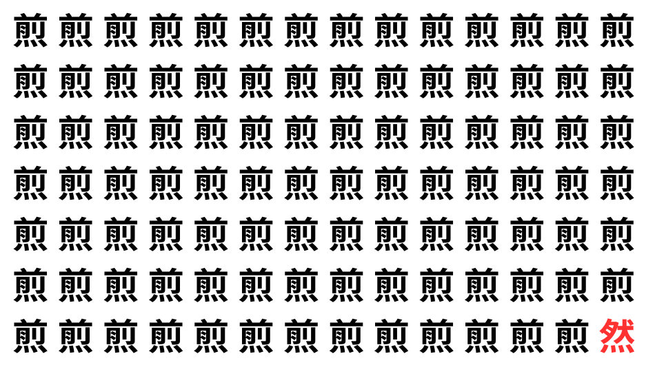 並んだ漢字の中に、ひとつだけ異なる文字が紛れています。集中して探し出し、気分をリフレッシュしましょう!