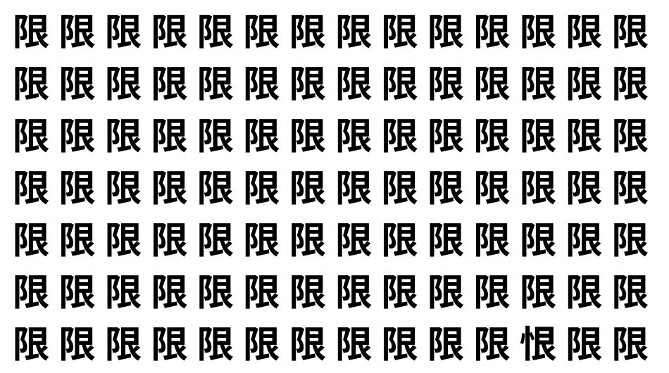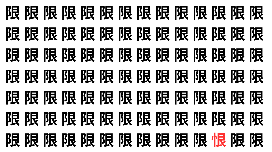 たくさんの「限」の中に、よく似た別の漢字が1文字だけ隠れています。