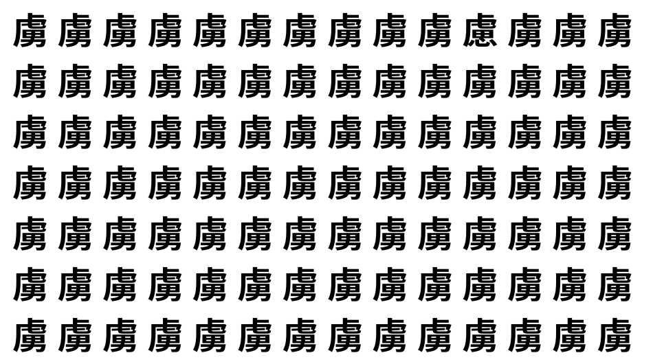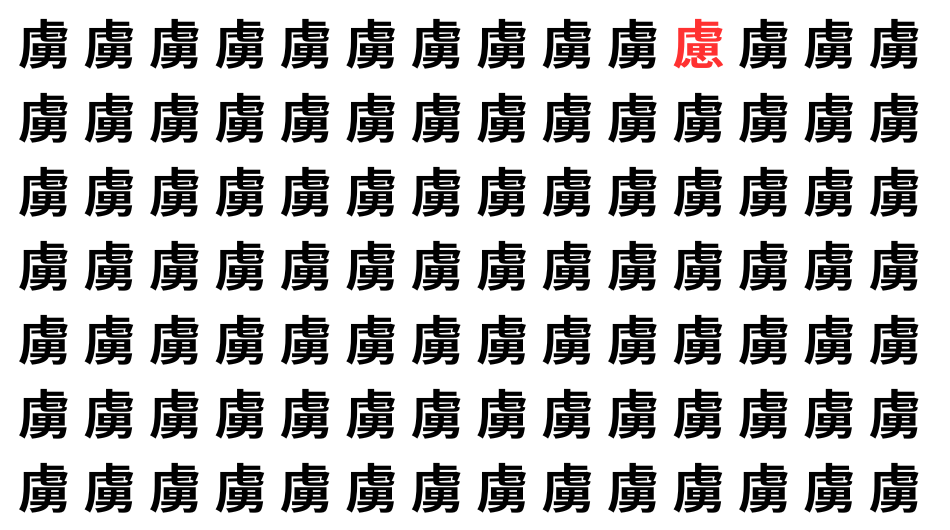 たくさんの「虜」の中に、よく似た別の漢字が1文字だけ隠れています。