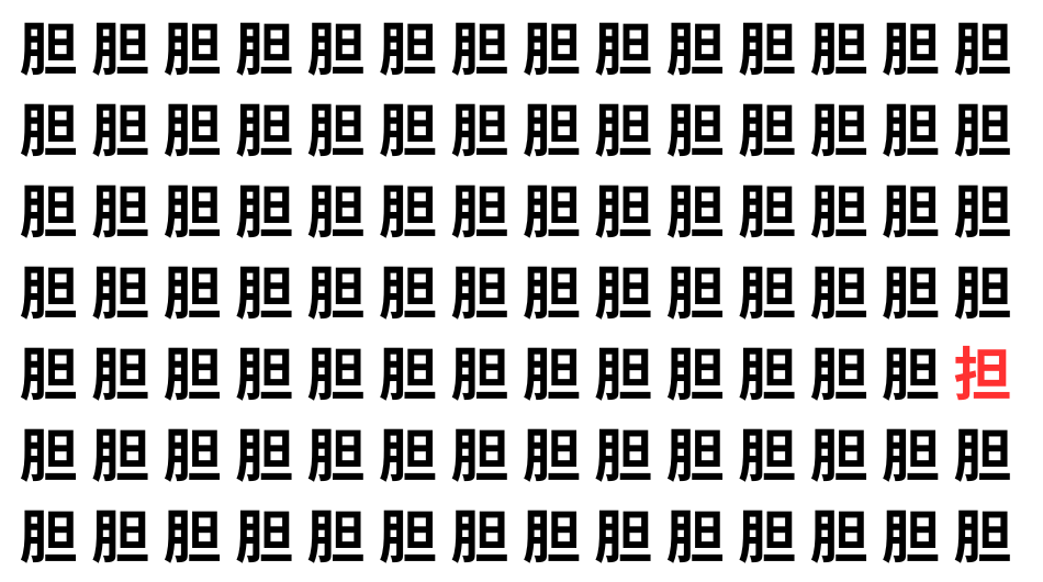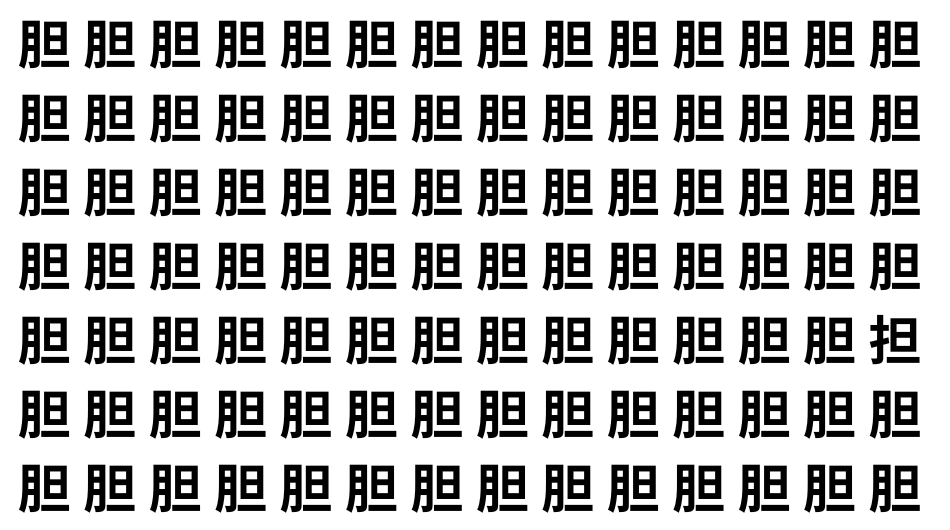 たくさんの「胆」の中に、よく似た別の漢字が1文字だけ隠れています。