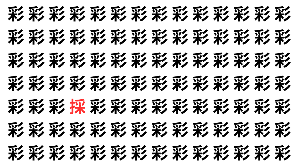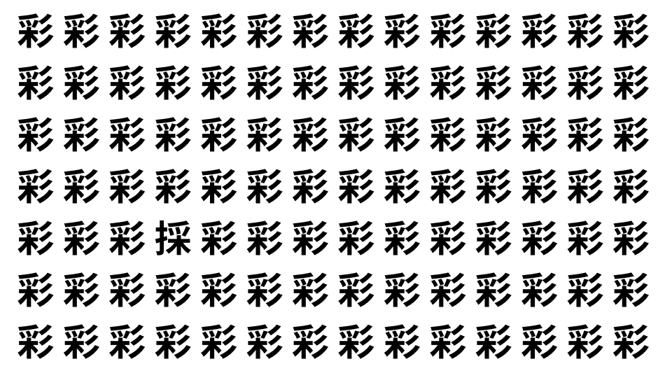 たくさんの「彩」の中に、よく似た別の漢字が1文字だけ隠れています。