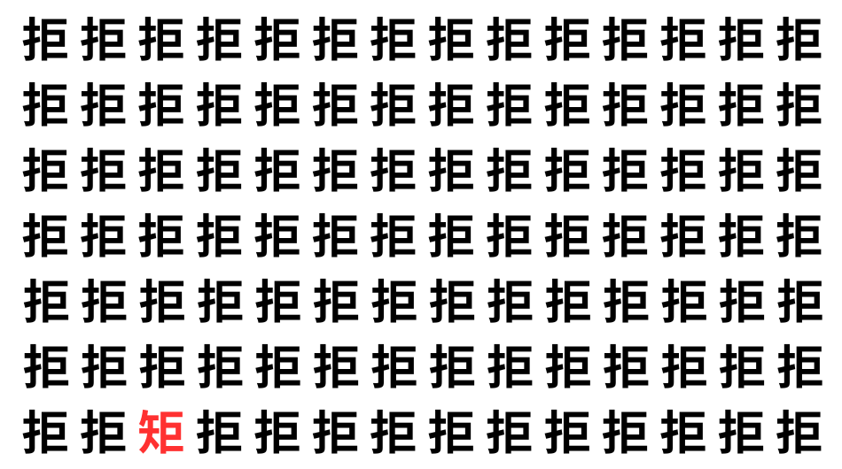 たくさんの「拒」の中に、よく似た別の漢字が1文字だけ隠れています。