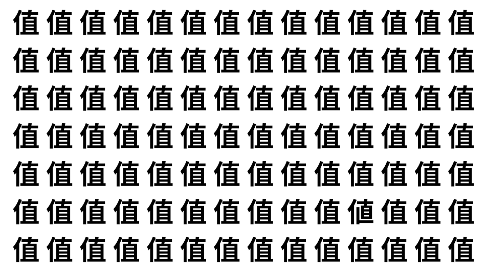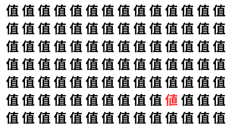 たくさんの「值」の中に、よく似た別の漢字が1文字だけ隠れています。