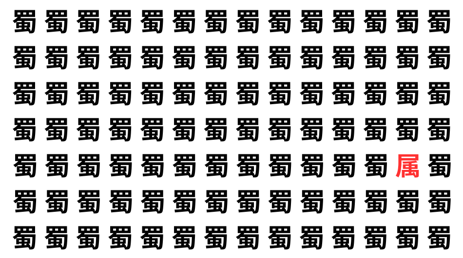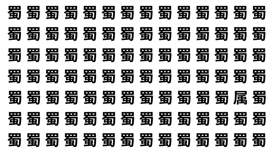 たくさんの「蜀」の中に、よく似た別の漢字が1文字だけ隠れています。