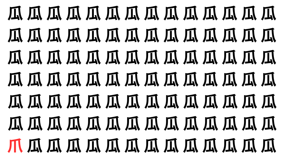 たくさんの「瓜」の中に、よく似た別の漢字が1文字だけ隠れています。
