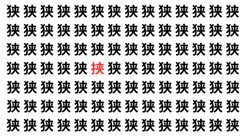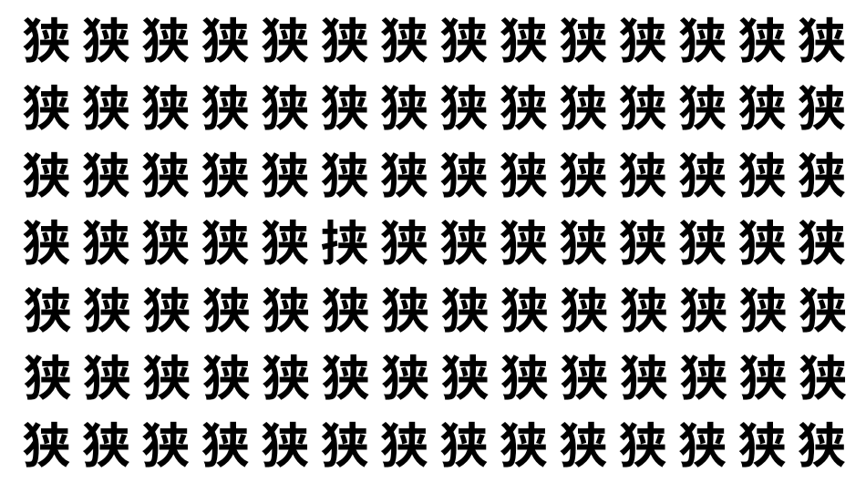 たくさんの「狭」の中に、よく似た別の漢字が1文字だけ隠れています。