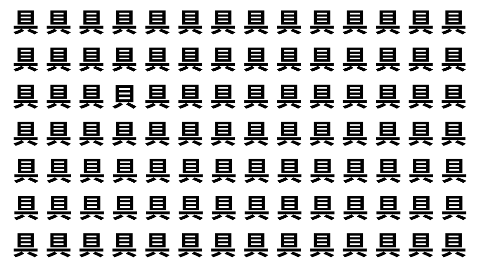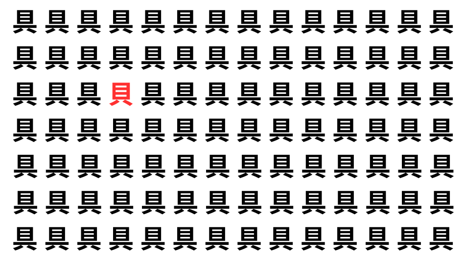 たくさんの「具」の中に、よく似た別の漢字が1文字だけ隠れています。