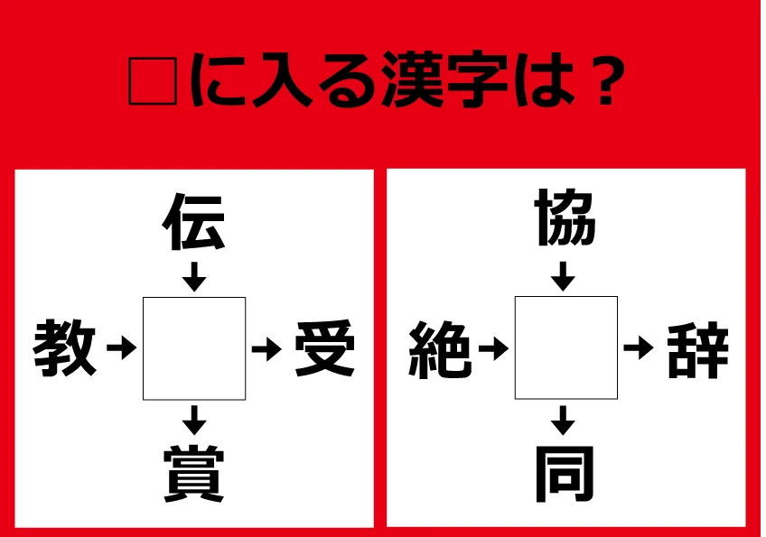 【漢字パズル】教□、伝□、□受、□賞 □に入る漢字は何?