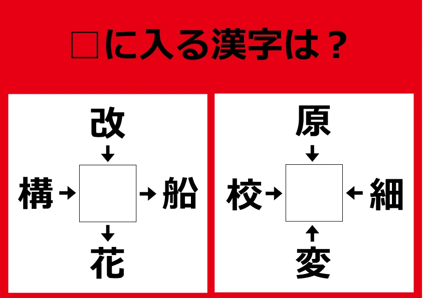 【漢字パズル】構□、改□、□船、□花 □に入る漢字は…?