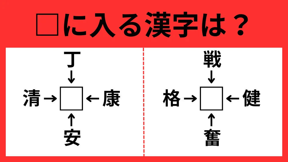 【漢字パズル】難問です!丁□、康□、安□、清□ □に入る漢字は…?