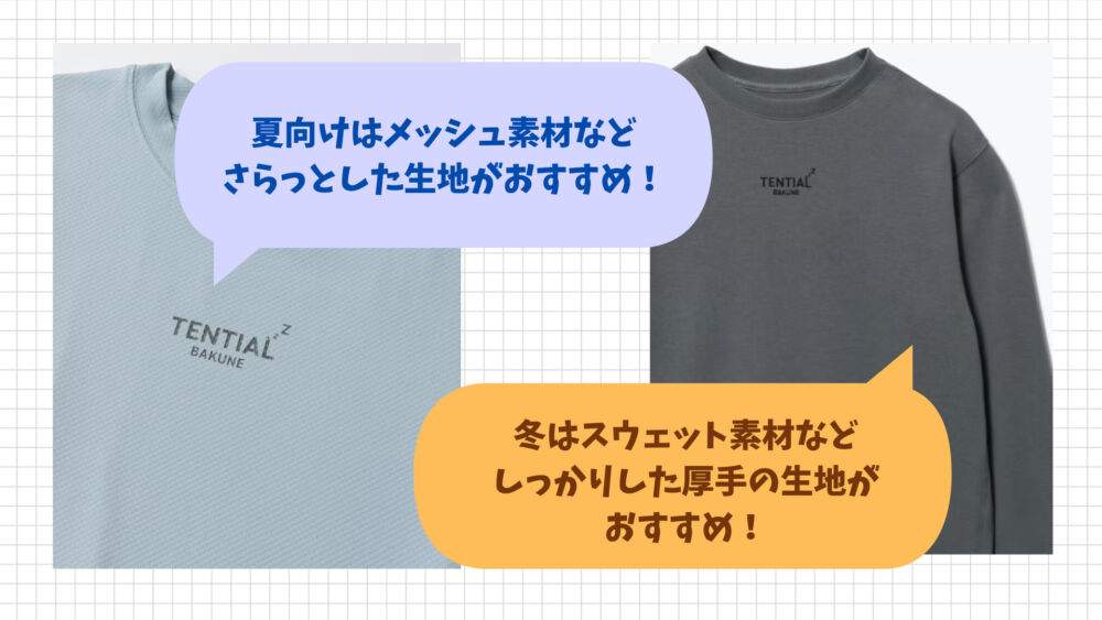 春夏向けの薄手素材、秋冬向けのスウェット・ニット系、通年向けなど、季節との相性で満足度は大きく変わります。暑すぎる、寒すぎる、肌に合わないという理由で使わなくなると意味がありません。