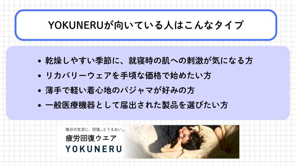 疲労回復をサポートする設計と保湿繊維の使用の両方に注目したい方にとって、YOKUNERUは有力な選択肢のひとつです。