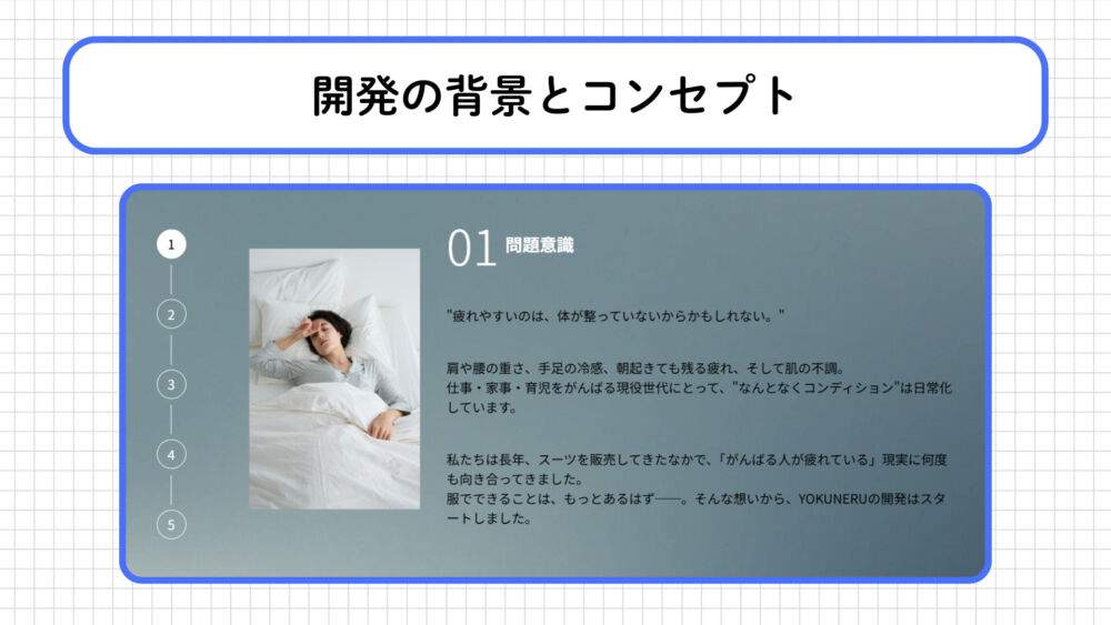 日中のビジネスウェアで活動時間(オン)を支えるだけでなく、「人の健康を24時間サポートできないか?」と考えたことが、夜の休息時間(オフ)に寄り添うYOKUNERU開発の原点になったそうです。