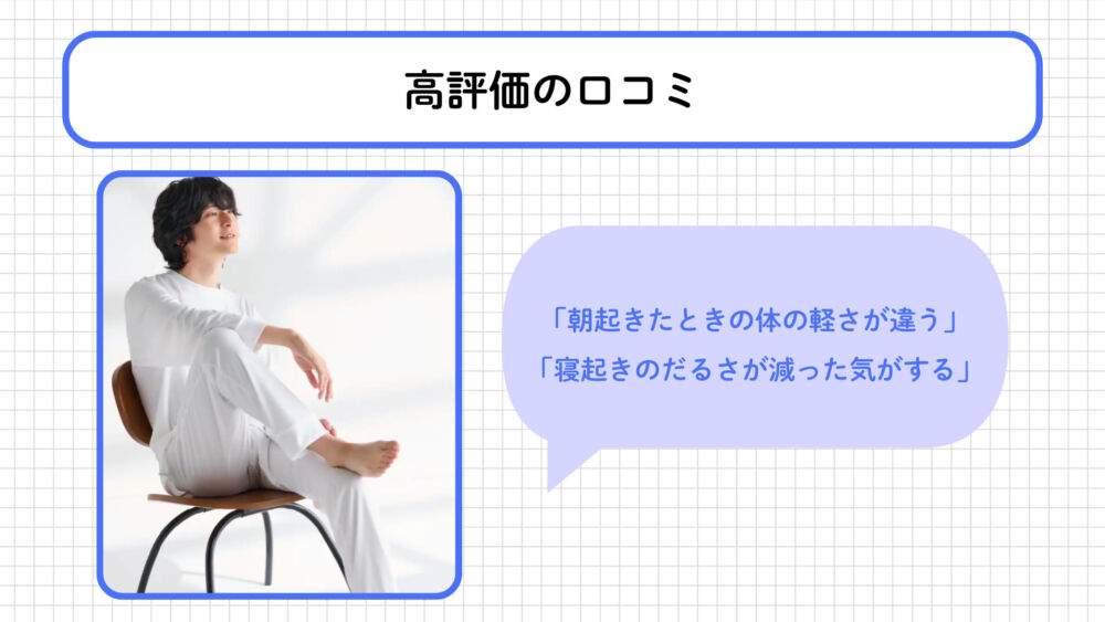 「朝起きたときの体の軽さが違う」「寝起きのだるさが減った気がする」といった、睡眠の質に関する前向きな口コミも多く寄せられています。