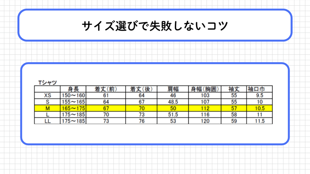 購入前にサイズ表をしっかり確認し、不安がある場合は取り扱い店舗でサイズ感を確認するのが安心です。