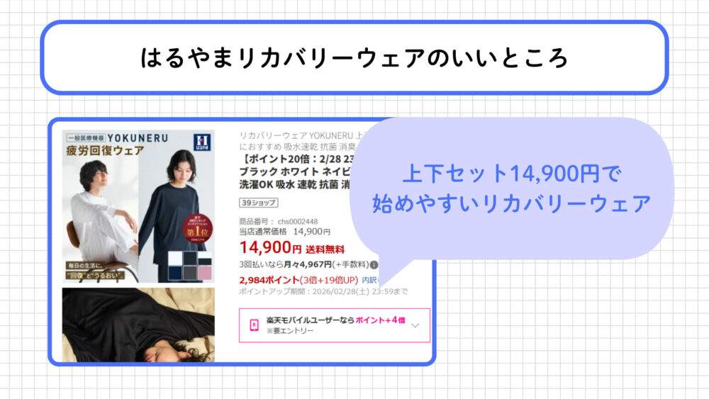 YOKUNERUは上下セットで14,900円(税込)と、初めてのリカバリーウェアとして検討しやすいです。